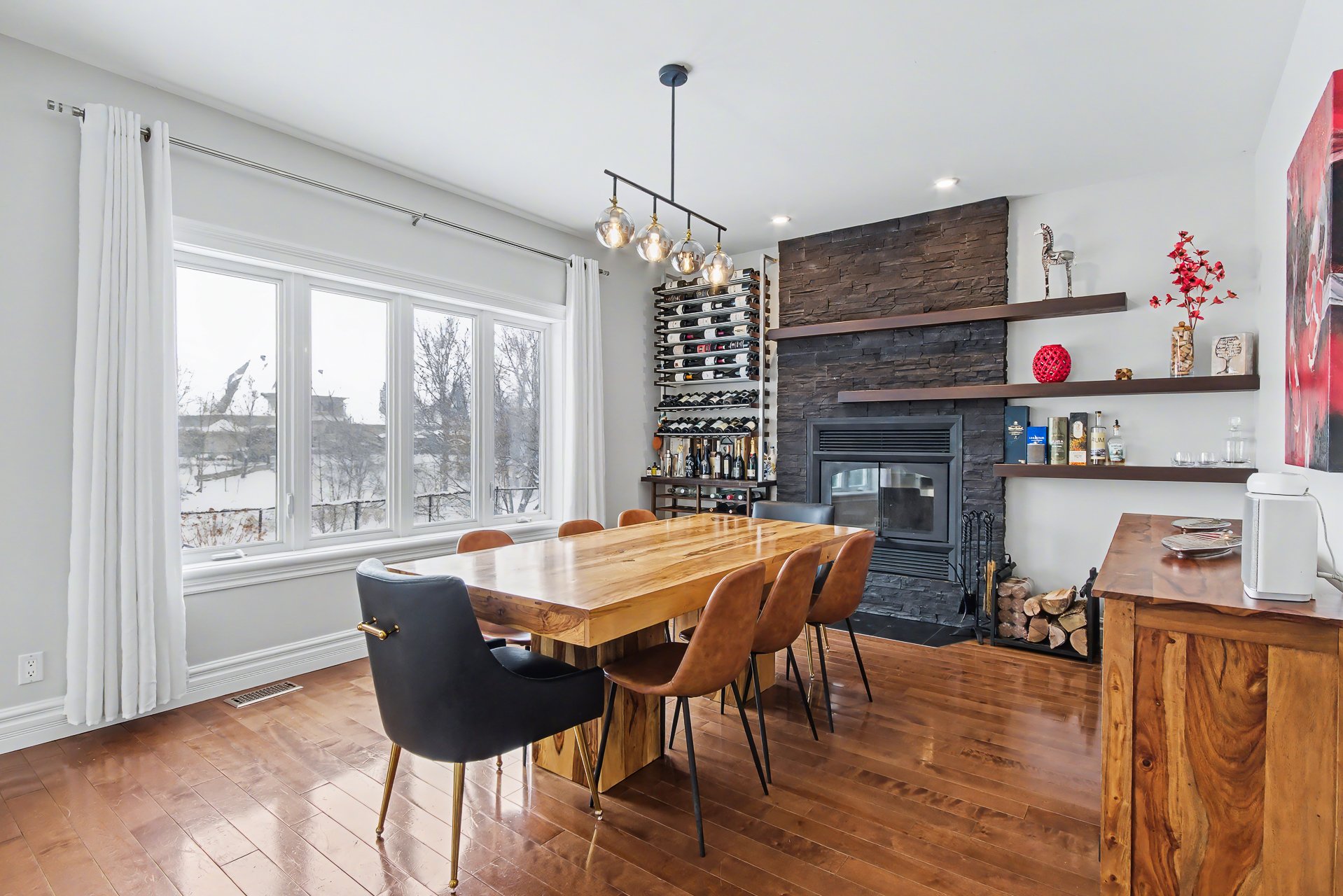 Planchers de bois franc et foyer au bois pour une