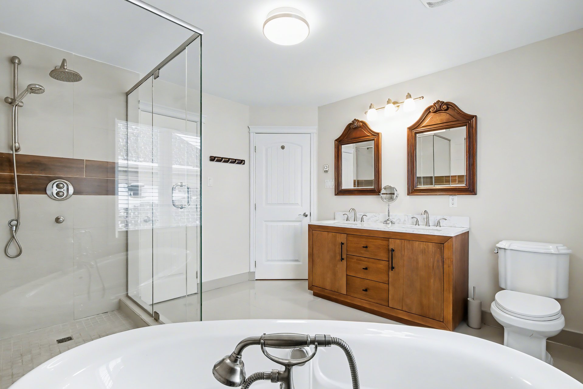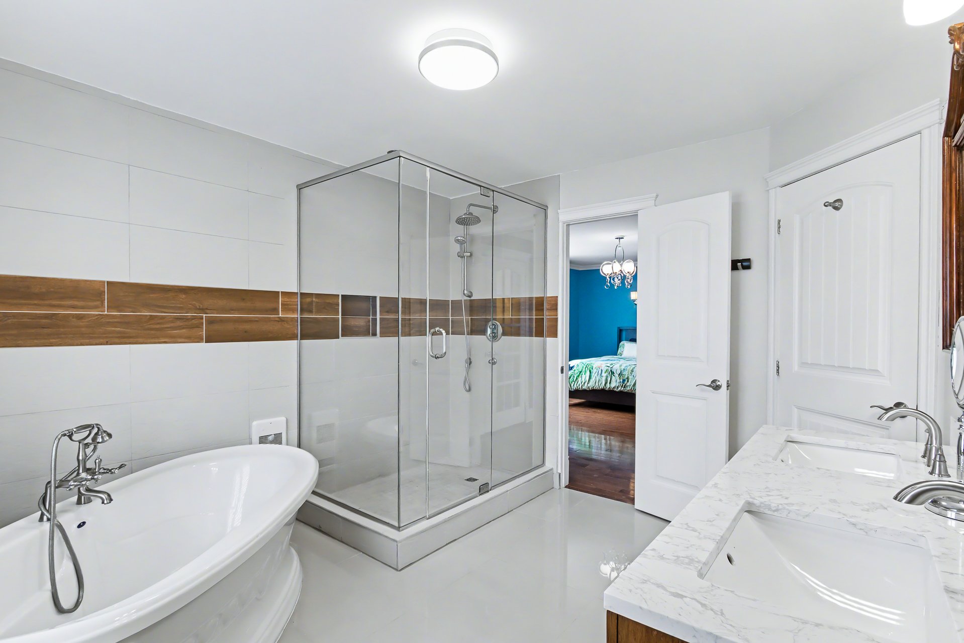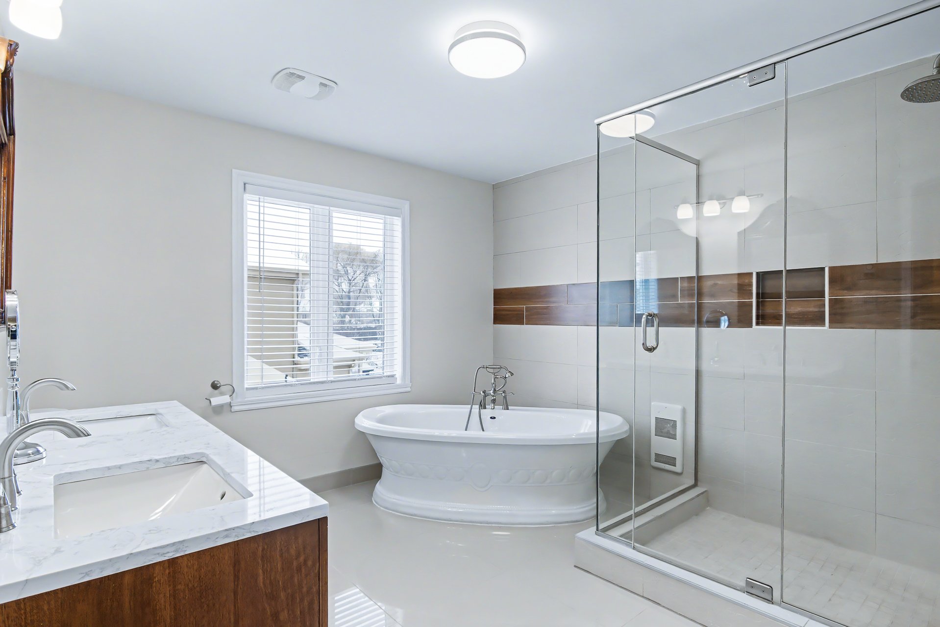 Large renovated bathroom with ceramic shower. Two