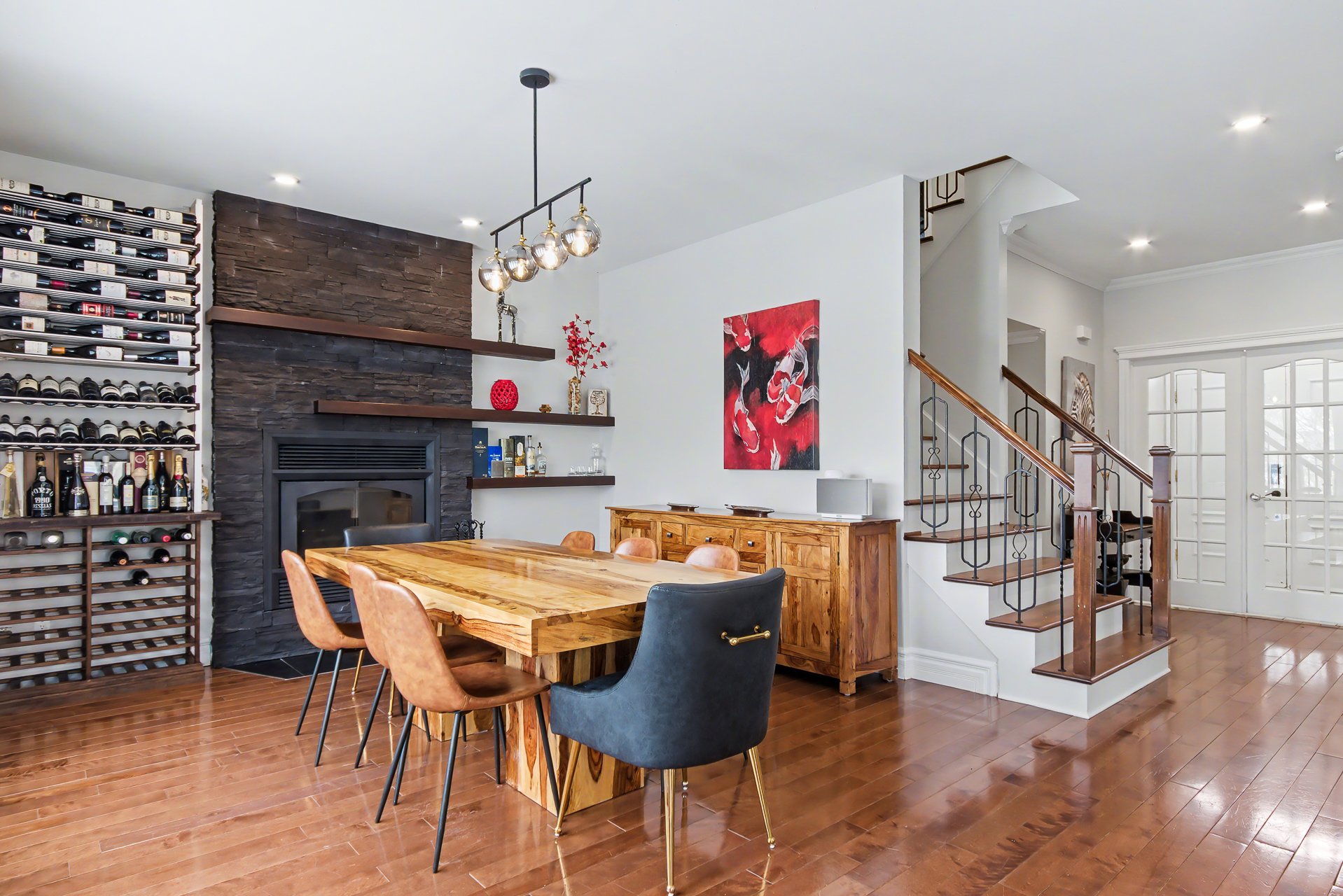 Hardwood floors and a wood-burning fireplace create a warm